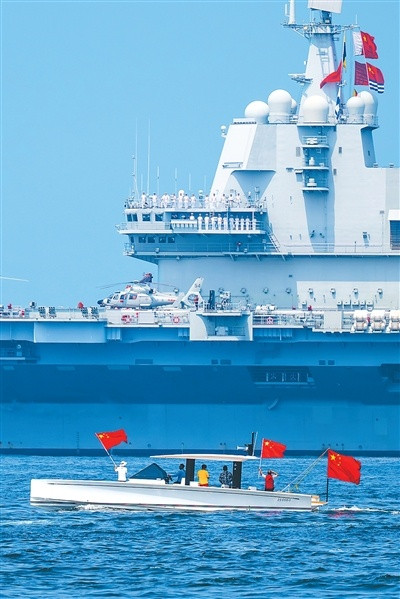 7月7日,市民乘船手举国旗敬礼,为山东舰送行。 新华社记者 朱 炜摄